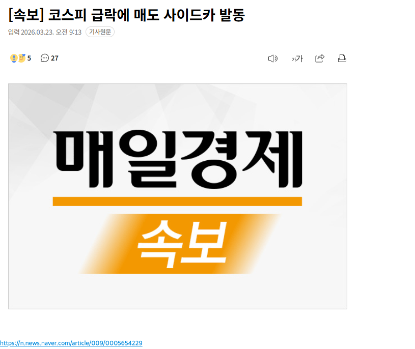 [속보] 코스피 떡락하고 매도 사이드카 발동됨